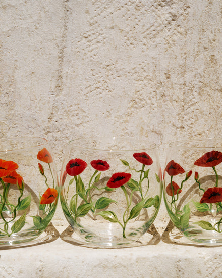 Our glassware are entirely hand-painted. To preserve their shine and appearance, we recommend avoiding the dishwasher and washing them gently by hand with mild soap.