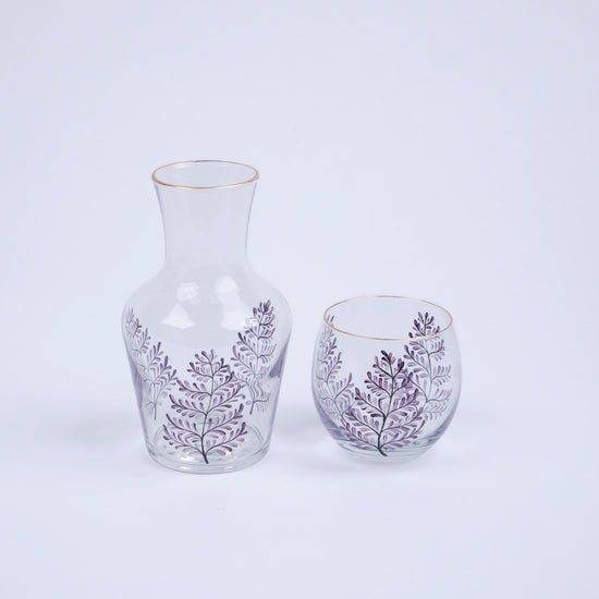 Bedside Water Carafe & Glass Set Hand-Painted Aubergine Leaves