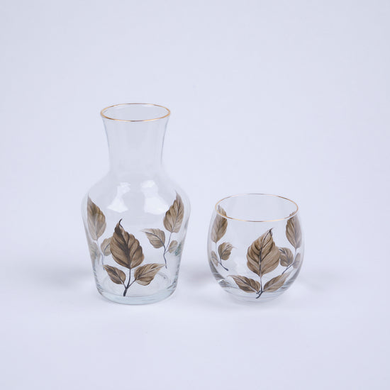 Our Bedside Water Carafe & Glass Set Hand-Painted Olive Leaves combines timeless leaf artistry with elegant functionality for your bedside table.