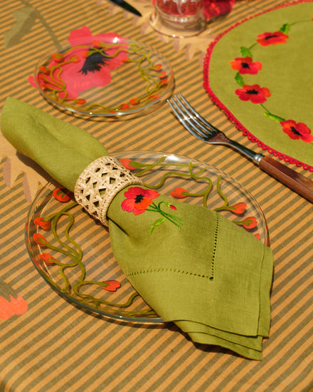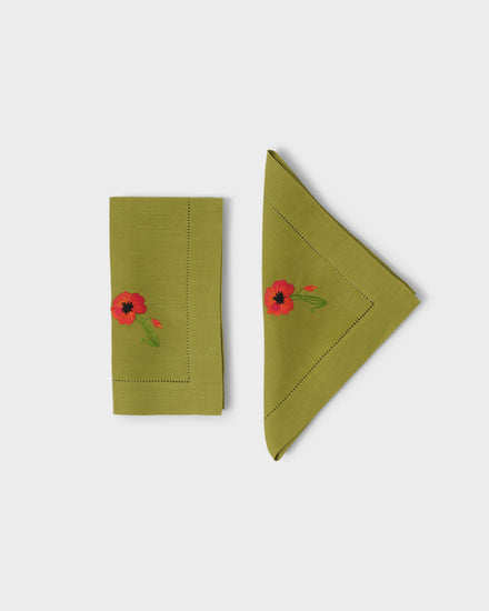 The Crini & Sophia Poppy Green Napkins features a single beautifully embroidered red poppy on each soft green linen napkin, with intricate stitching that brings the vibrant flowers to life, adding a stunning contrast and refined elegance to your table setting.