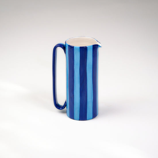 Beautifully hand-painted, our Striped Indigo Blue Tall Ceramic Carafe brings a touch of refined charm to every pour.