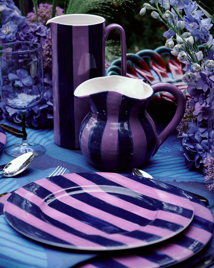 Introducing our Striped Purple Short Ceramic Carafe . This striking piece features bold, hand-painted stripes in rich, purple, creating a vibrant and modern look that enhances any dining space.